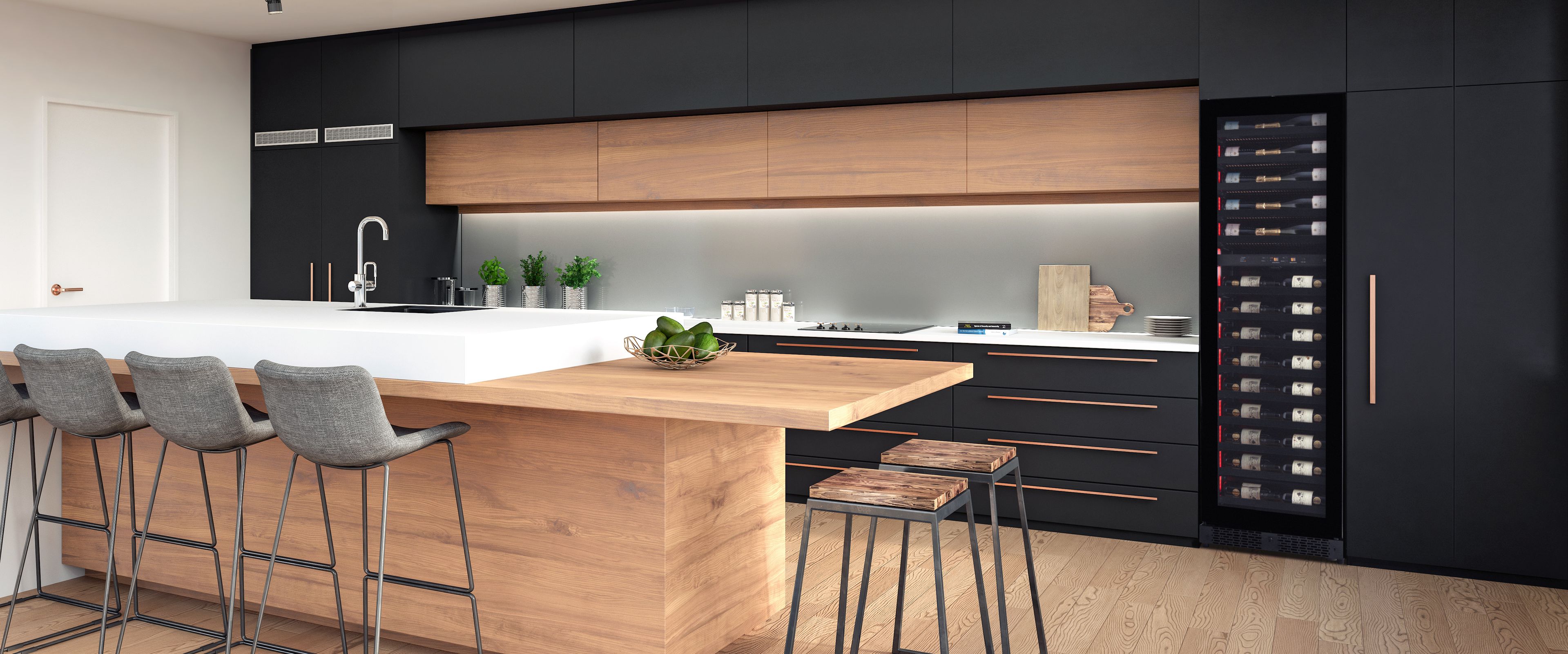 Une cave à vin intégrée est conçue pour être intégrée dans une unité de cuisine existante, ce qui est une solution très attrayante dans une cuisine moderne. La porte de la cave à vin a la même largeur que le module de cuisine pour couvrir les côtés du meuble de cuisine, tandis que le reste de la cave à vin est plus étroit afin qu'elle s'adapte au module de cuisine existant. Comme pour les deux autres types de caves à vin, il est important que l'air chaud puisse s'échapper de la cave à vin intégrée. Il est particulièrement important que l'air puisse s'échapper à l'arrière et vers le haut pour un passage libre au sommet de l'armoire. Assurez-vous également d'avoir une prise d'air au bas de votre placard de cuisine, par exemple en installant une grille.